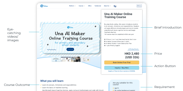 The first content section gives users the most important informations, include course highlight, brief introduction and price, etc. Thus, they can understand the content of the course quickly, and push them to take action to book a trial lesson.